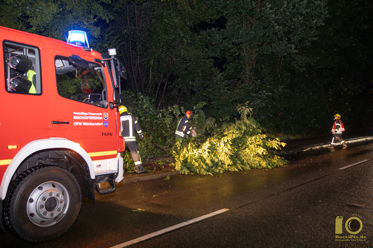 Bischofswerda: Die Kameraden der Freiwilligen Feuerwehren aus Goldbach und Weickersdorf wurden am Abend gegen 21:30 Uhr zu einem umgestürzten Baum auf die B6 alarmiert. Der Melder des Baumes beschrieb der Leitstelle in Hoyerswerda jedoch einen falschen Standort. Der Baum lag jedoch unmittelbar nach dem Ortseingang in Bischofswerda. Die Kameraden packten alle gemeinsam mit an und konnten den umgestürzten Kirschbaum rasch von der S111 räumen.